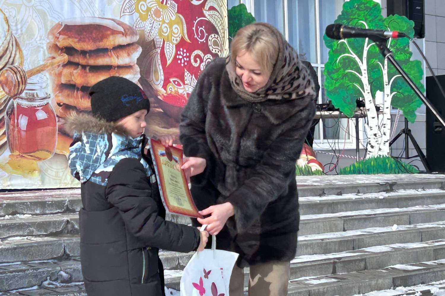 Начальник отдела культуры, спорта, молодёжной политики и архивного дела администрации Первомайского округа Ирина Чермошенцева наградила победителей, призёров и участников конкурса масленичных поделок «Ясно солнышко».