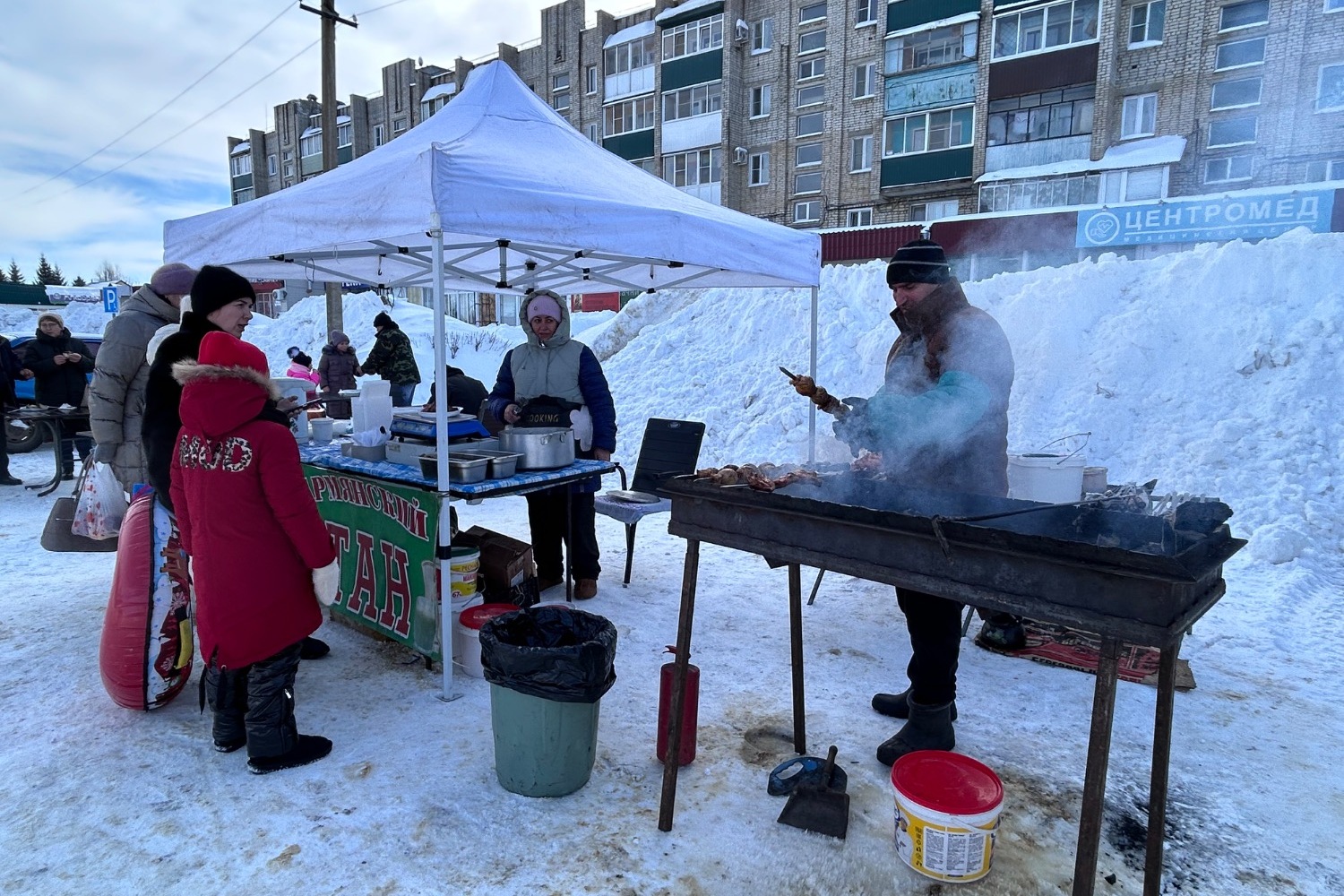 На площади работала выездная торговля. Гости праздника лакомились румяными блинами и свежей выпечкой, ароматным шашлыком.