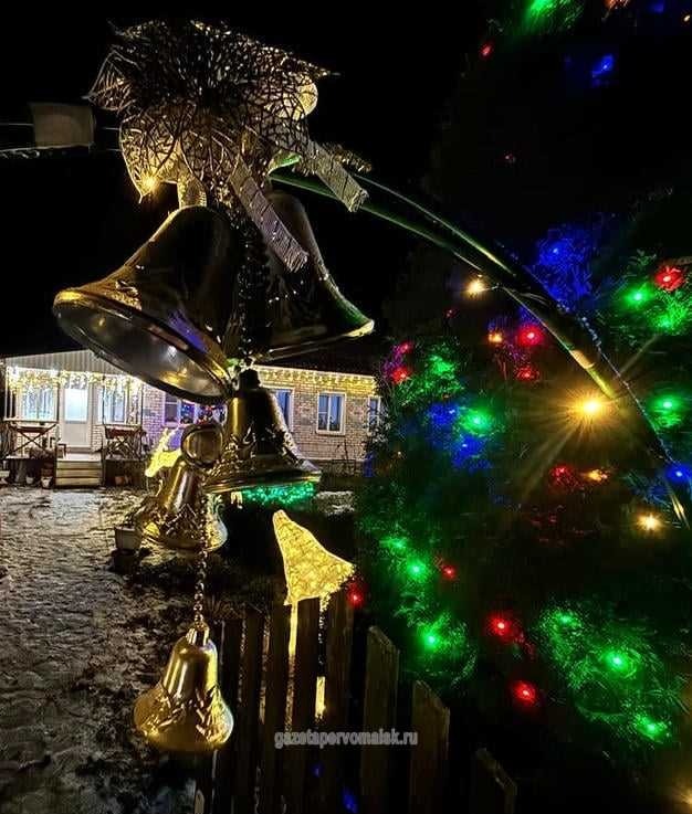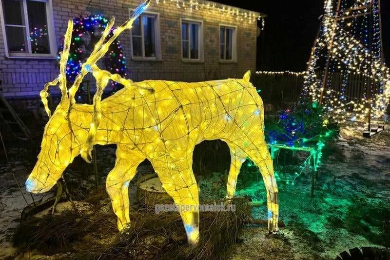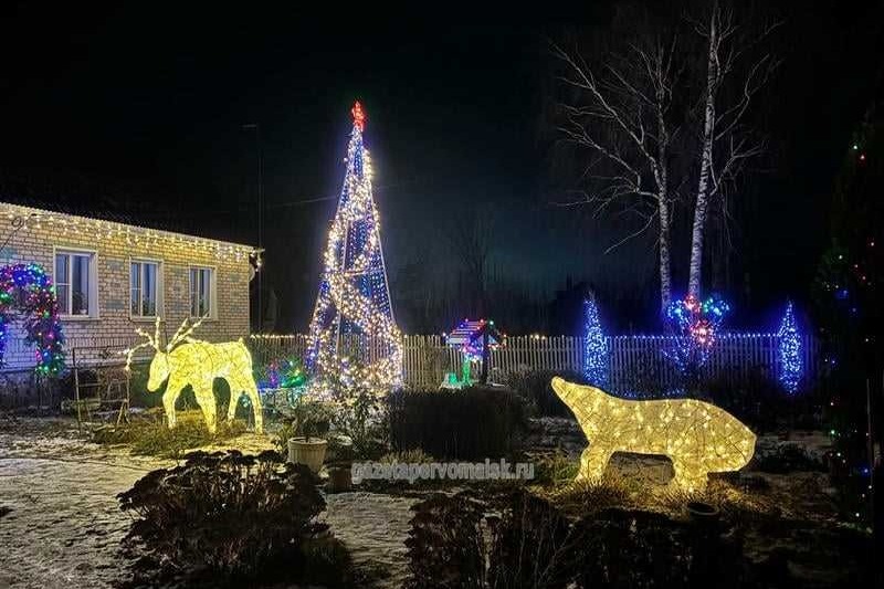 Во дворе Алексея большая новогодняя композиция — высокая туя с гирляндой, медведь Умка, олень с телегой, гружённой ёлками, яркий колодец, украшенная рамка для цветов, разноцветные колокольчики. Центральное место, конечно же, занимает ель, сделанная из металла.