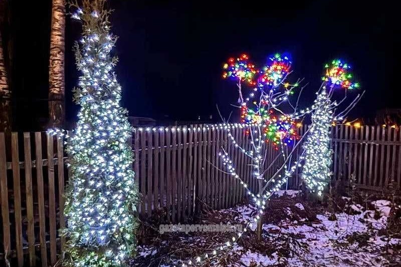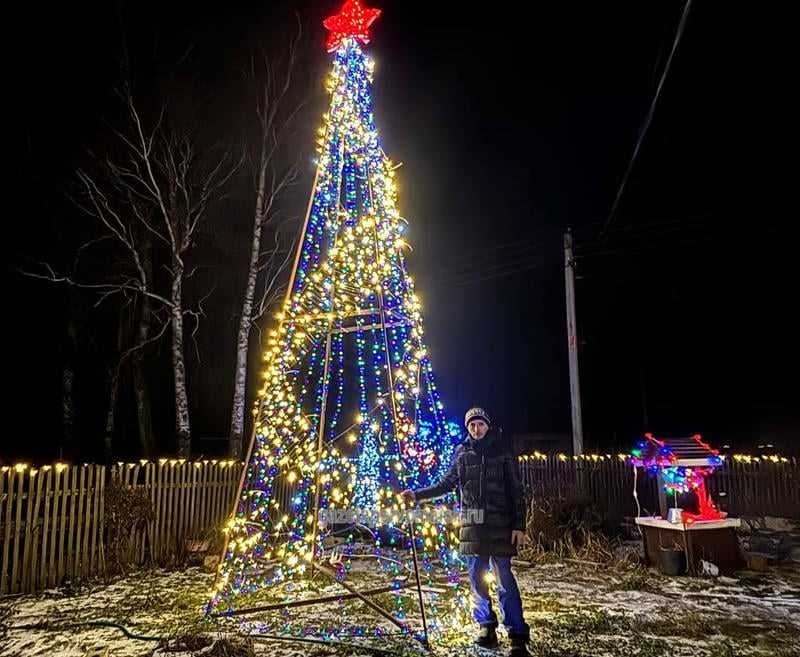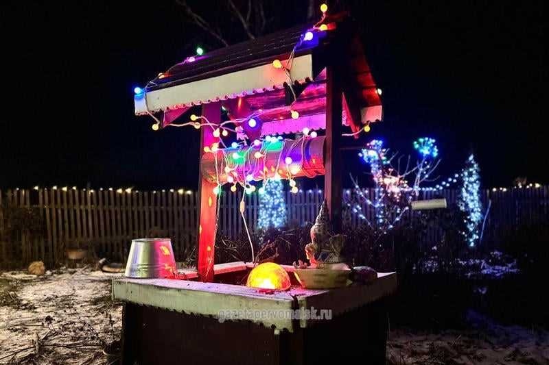 Металлоконструкцию ели Алексей сделал сам. Верхушку импровизированного новогоднего дерева украшает красная звезда, а по осям — разноцветные гирлянды. Новогоднее оформление и у колодца. На маленьких туях, вдоль забора и по периметру дома также развешаны разноцветные гирлянды. Всё здесь играет яркими красками под новогоднюю музыку. Её Алексей включает вечерами.