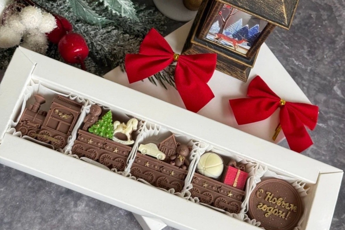 К праздникам Екатерина радует родных и друзей сладкими тематическими подарками, делает угощения на заказ. К Новому году она изготовила из шоколада ёлочные шары, лошадей и подковы, паровоз, ёлки.