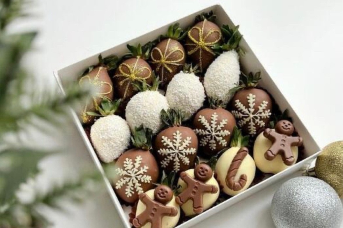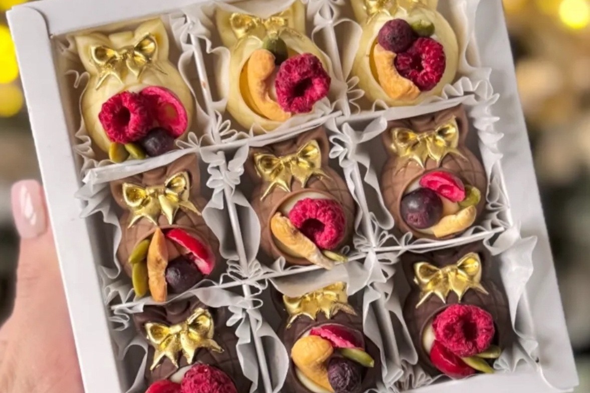 Готовые изделия Екатерина прокрашивает кандурином для блеска. В конфеты добавляет различные начинки: жидкие, орешки, сублимированные фрукты. Делает Екатерина и тематические плитки шоколада, а также клубнику и бананы в шоколаде.