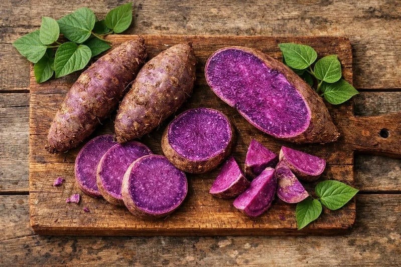 «Батат — сладкий фиолетовый картофель. Он нереально фотогеничный: яркий, насыщенный, будто создан для десертов. Здесь из него делают торты, мороженое, пирожные. Но, если честно, сердцем я всё равно за нашу обычную русскую картошку: простую, сытную», — написала матушка Эмилия.
