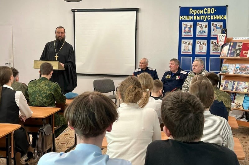Помощник благочинного Богоявленского благочиннического округа по работе с казачеством иерей Ярослав Гривас говорил с учащимися о патриотизме, о том, как важно уважать все народы, строить отношения в обществе, о разнице обычаев и взглядов.